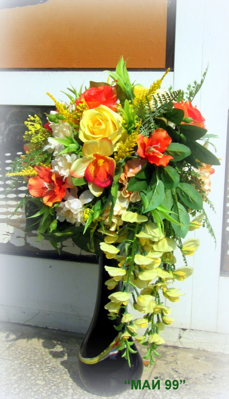 Богата аранжировка от пъстри жълто-оранжеви изкуствени цветя,много зеленина и елементи в елегантна черна гланцирана,керамична ваза с обща височина 55 см.в обемната част 30 см. и в основата 11 см.