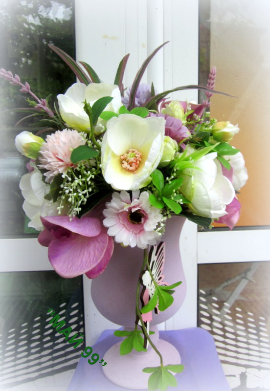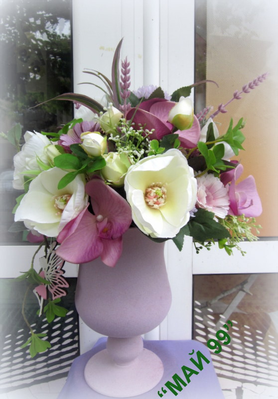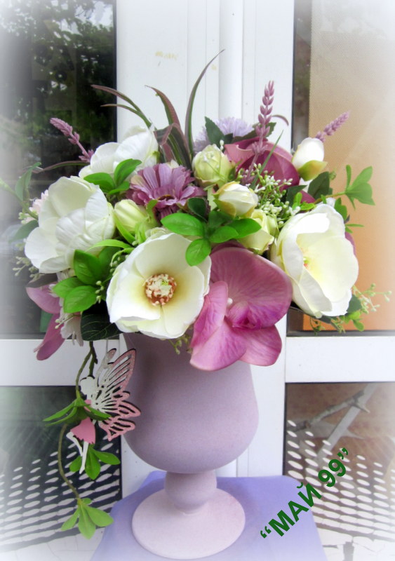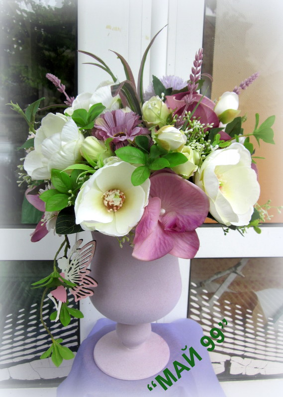 Елегантна и нежна,пищна композиция от изкуствени цветя/цвят пепел от рози/ в стъклен бокал,обвит в пастелно кадифе и висяща фея от дърво!