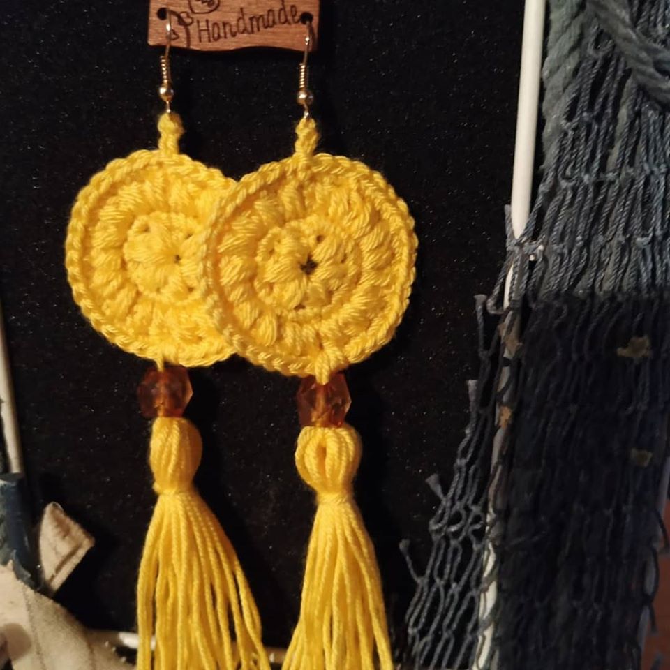 Crocheted earrings made of 100% cotton. Diameter about 5 cm, length 13 cm