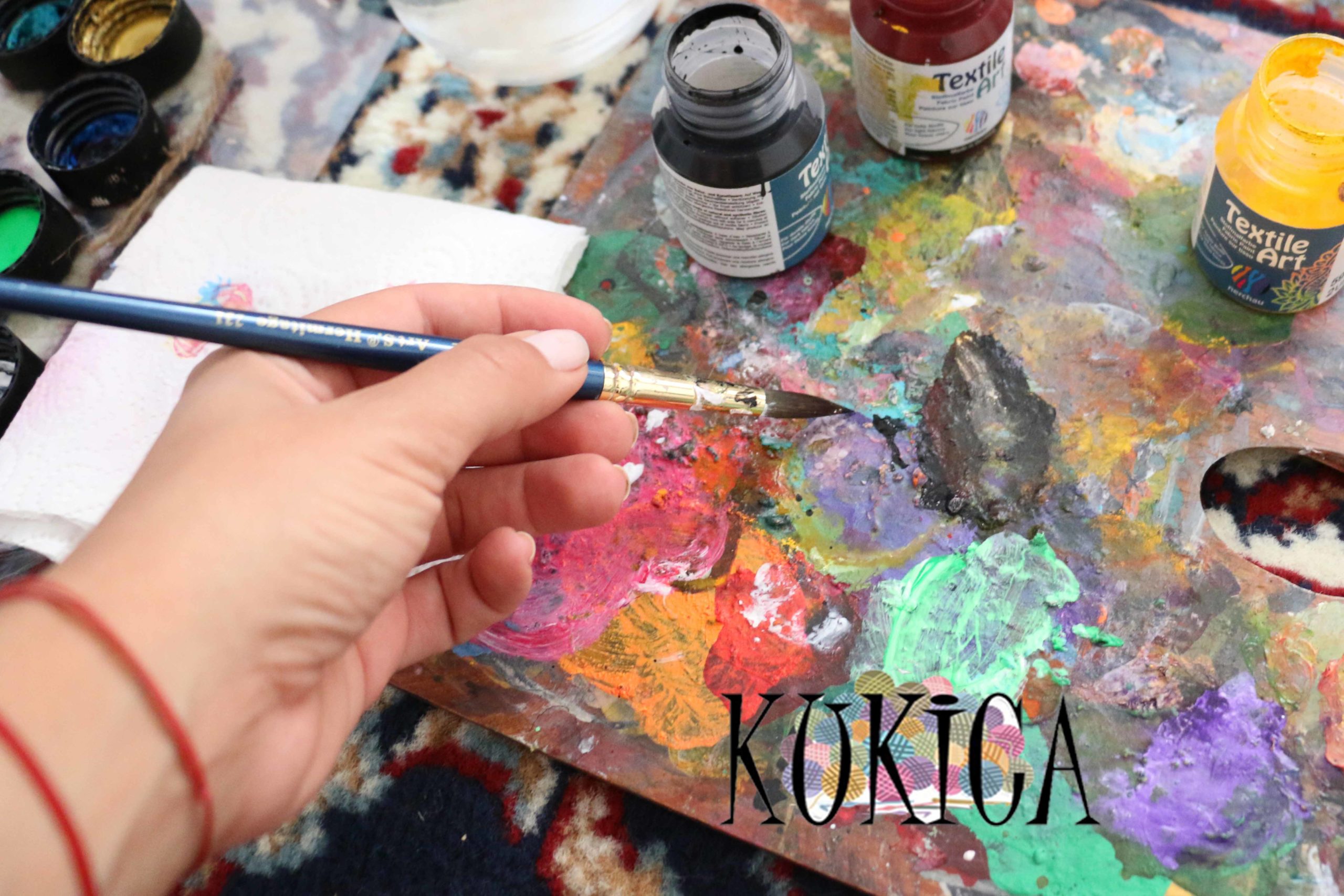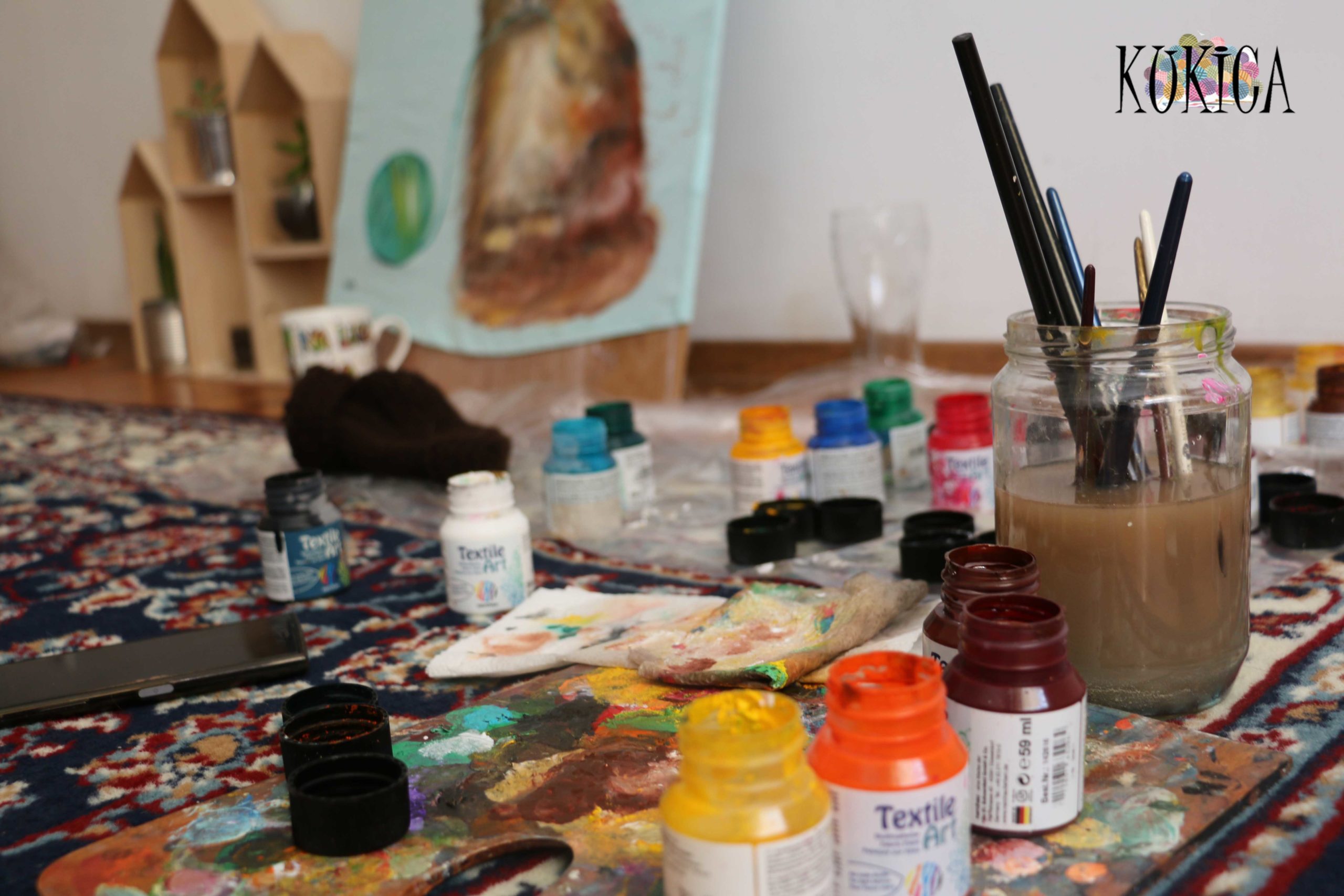 - Вода, палитра и салфетка – Вода и салфетка за четките, палитра за смесване на боите.