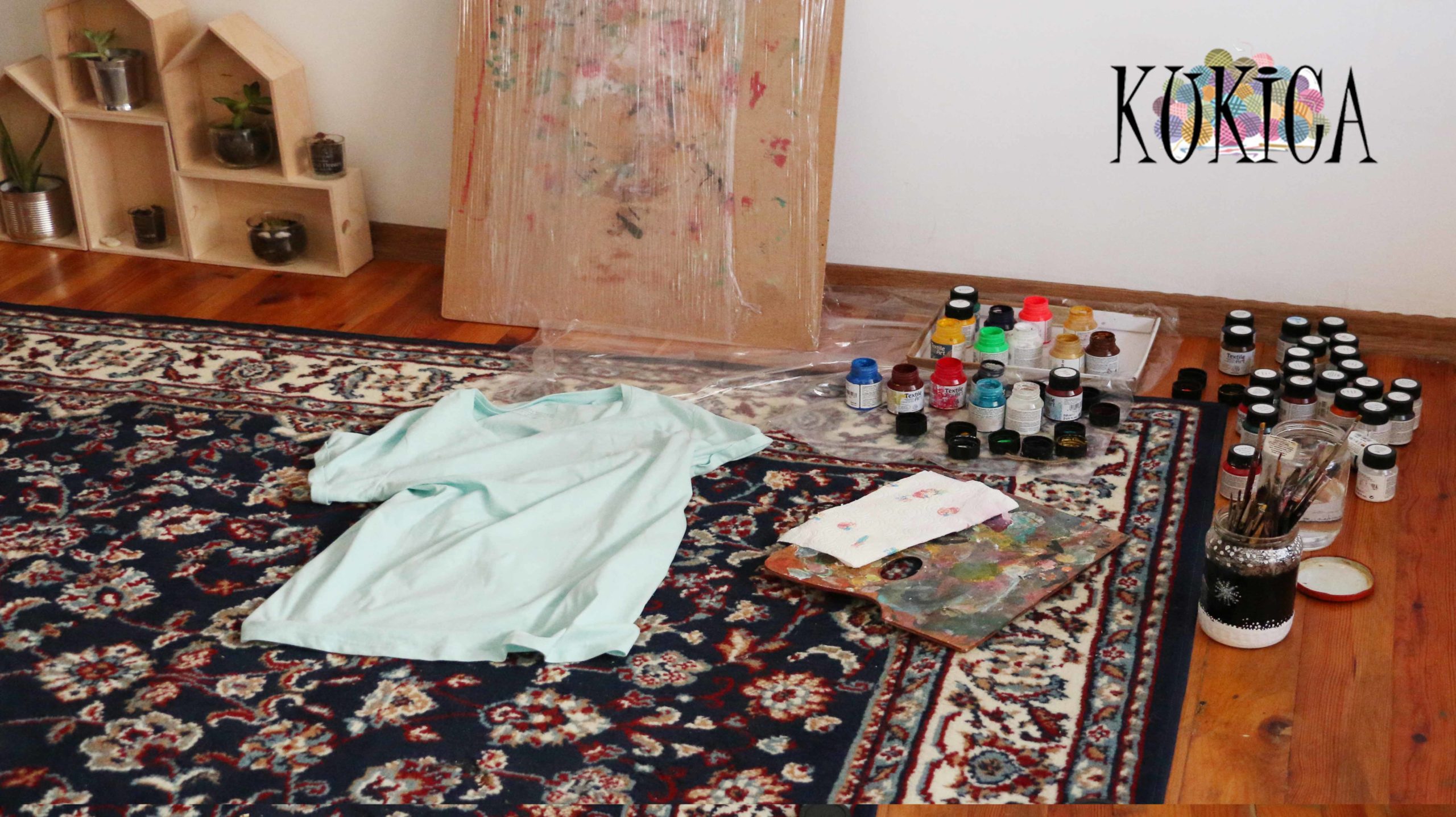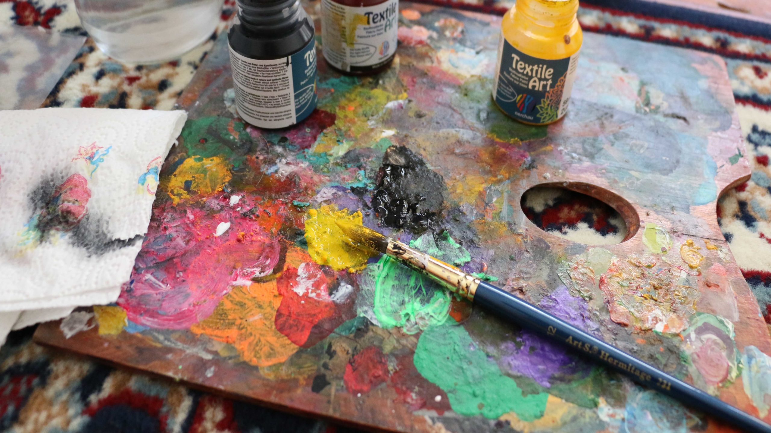 - Вода, палитра и салфетка – Вода и салфетка за четките, палитра за смесване на боите.