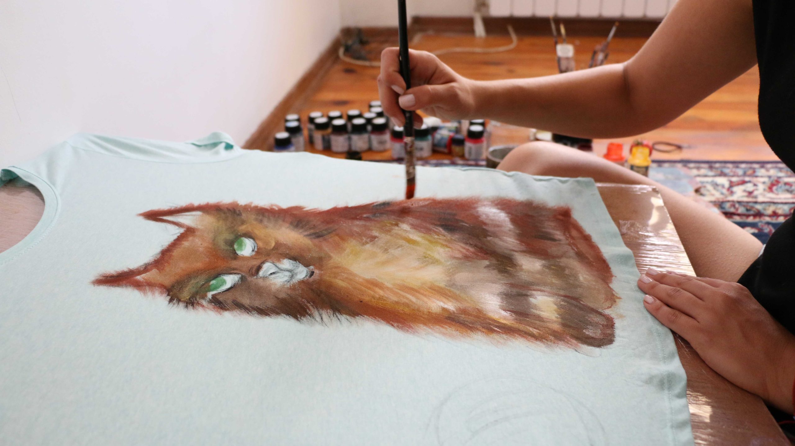 Изберете си изображение, което Ви допада и го скицирате на лист хартия, в размера, в който ще го нарисувате на тениската. С малко вода и боя започвате да скицирате основните линии на изображението върху текстила. Дори и да сбъркате не е фатално. Боите за текстил са покривни и винаги може да сложите друг цвят върху грешната линия. Тайната е, че светлата боя се покрива с тъмна и обратно.