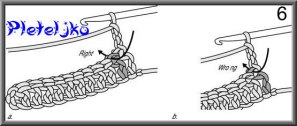 Ubodete kukicom kroz obe niti horizontalno položene petlje iz prethodnog reda a zatim na isti način obavijete nit. Obavijenu nit izvucite kukicom ispod položene petlje a nit ponovo obavijte oko kukice.